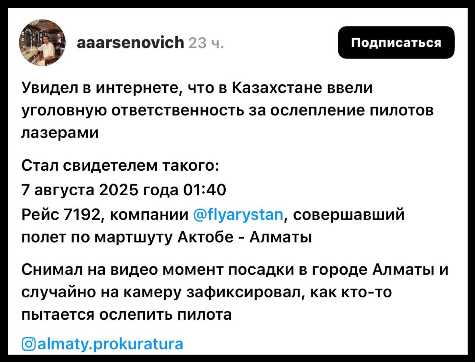 "Увидел в интернете, что в Казахстане ввели уголовную ответственность за ослепление пилотов лазерами. Стал свидетелем такого: 7 августа 2025 года, 01:40, рейс 7192 компании FlyArystan, совершал полёт по маршруту Актобе – Алматы. Снимал на видео момент посадки в Алматы и случайно на камеру зафиксировал, как кто-то пытается ослепить пилота", - написал пользователь в соцсетях.