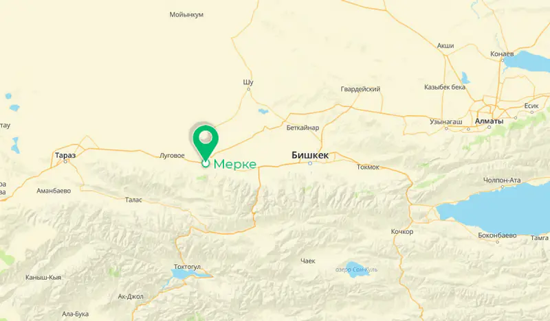 Мы отправились в село Мерке, административный центр Меркенского района Жамбылской области. Это село расположено в 155 километрах от ближайшего города Тараза, до которого можно доехать за 1,5 часа по трассе А-2. Расстояние от Алматы составляет 342 километра.