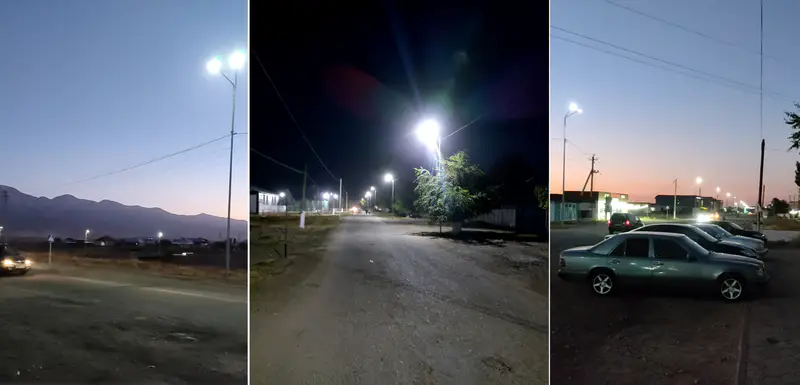 Вечернее освещение: 1, 3 — Мерке, улица Сарымолдаева, 2 — первое отделение, поселок Интернациональный. Фото: ©️ Юлия Колмогорова