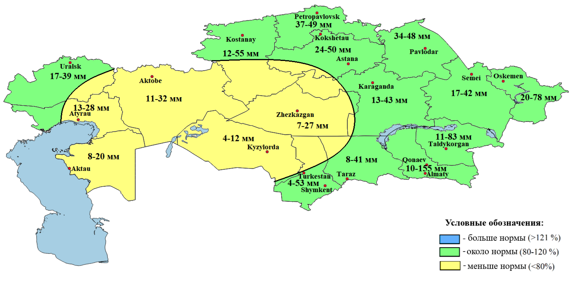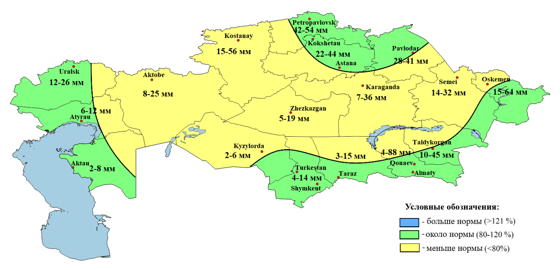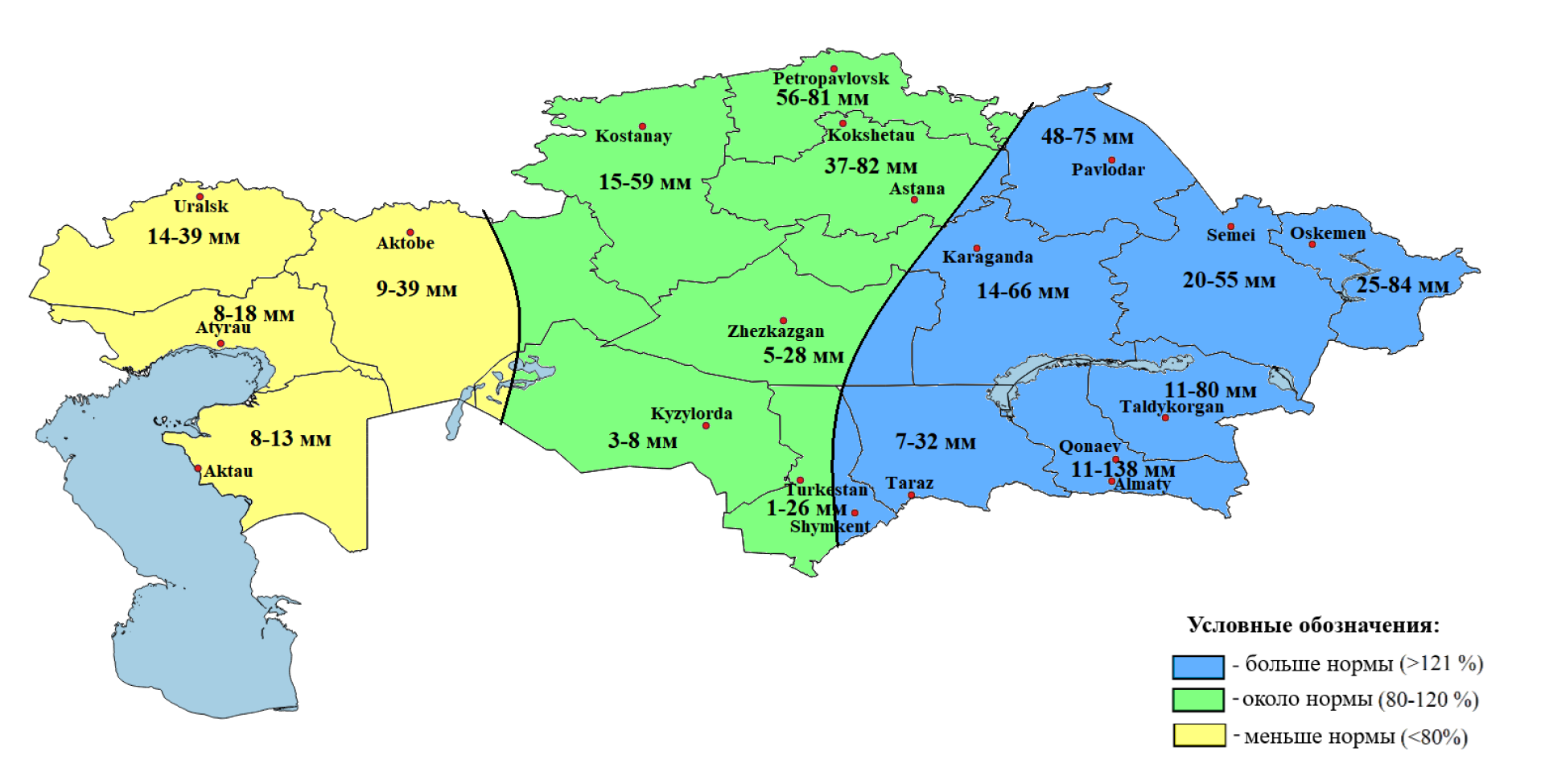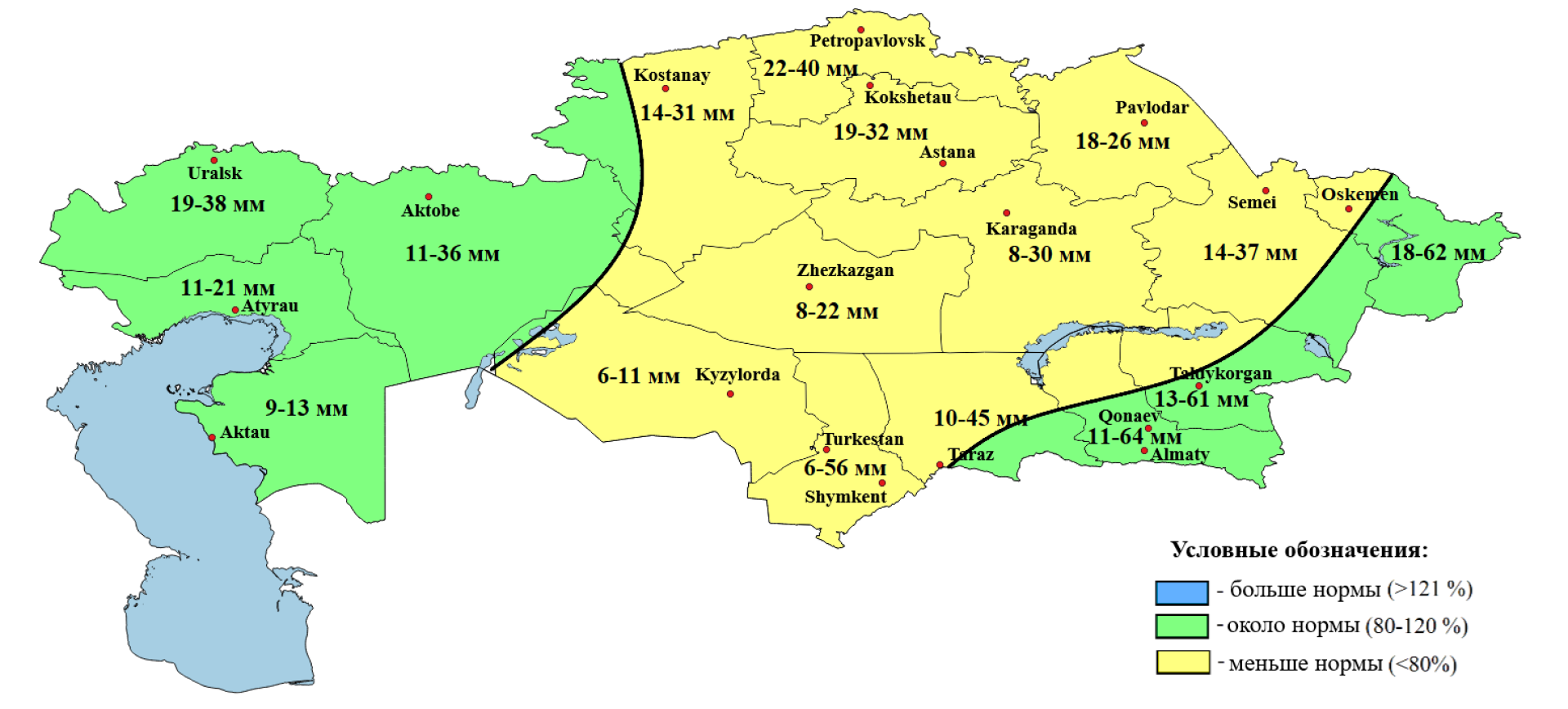 - Меньше нормы — в северных областях (Костанайская, СКО, Акмолинская) и частично в западных и центральных регионах.