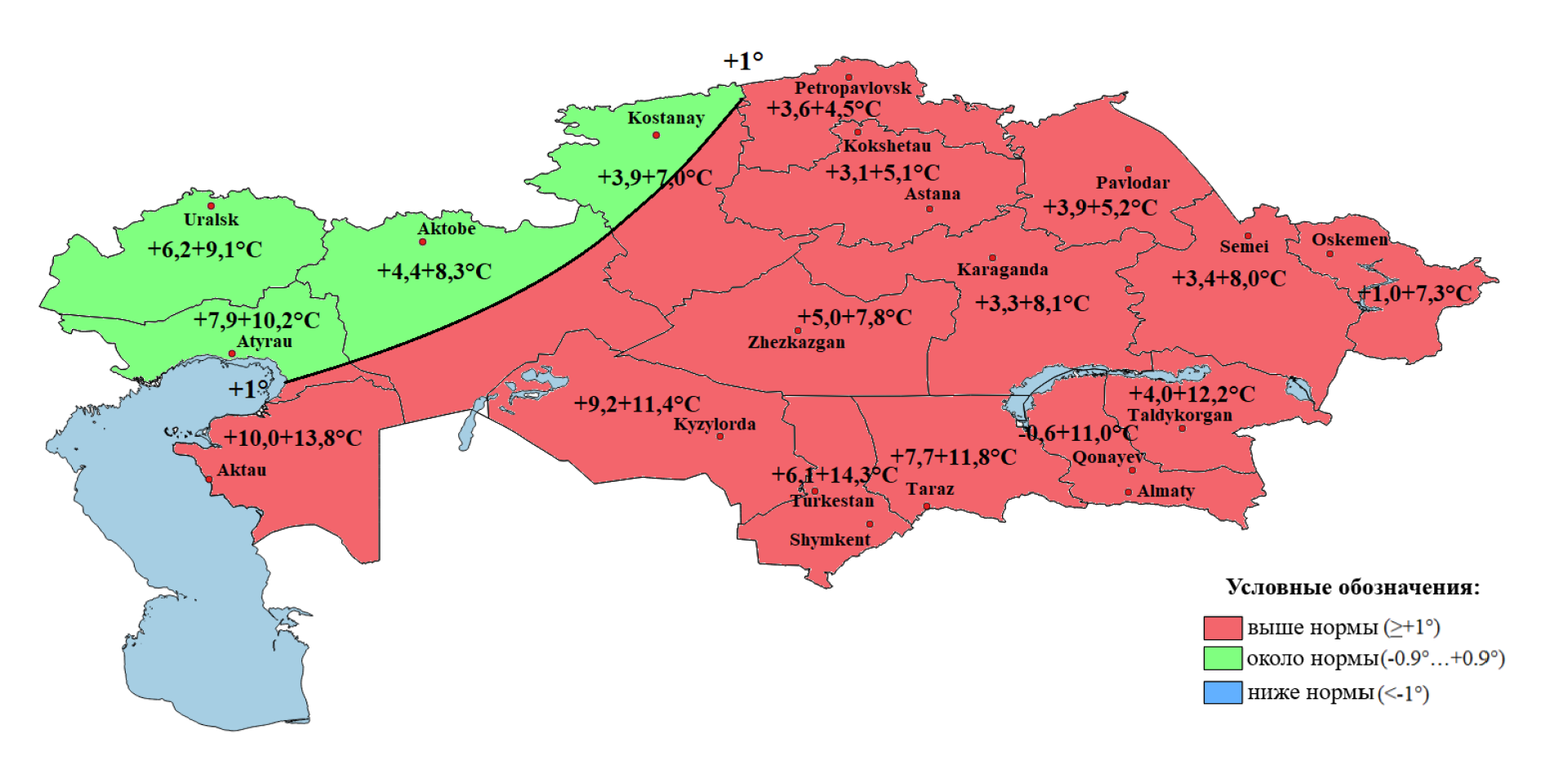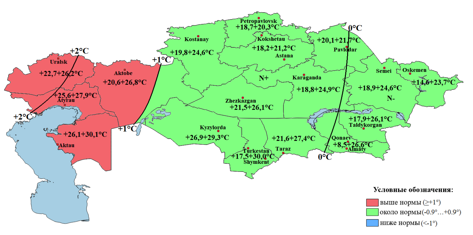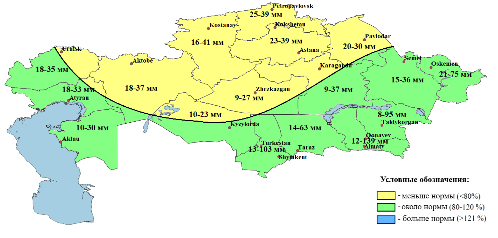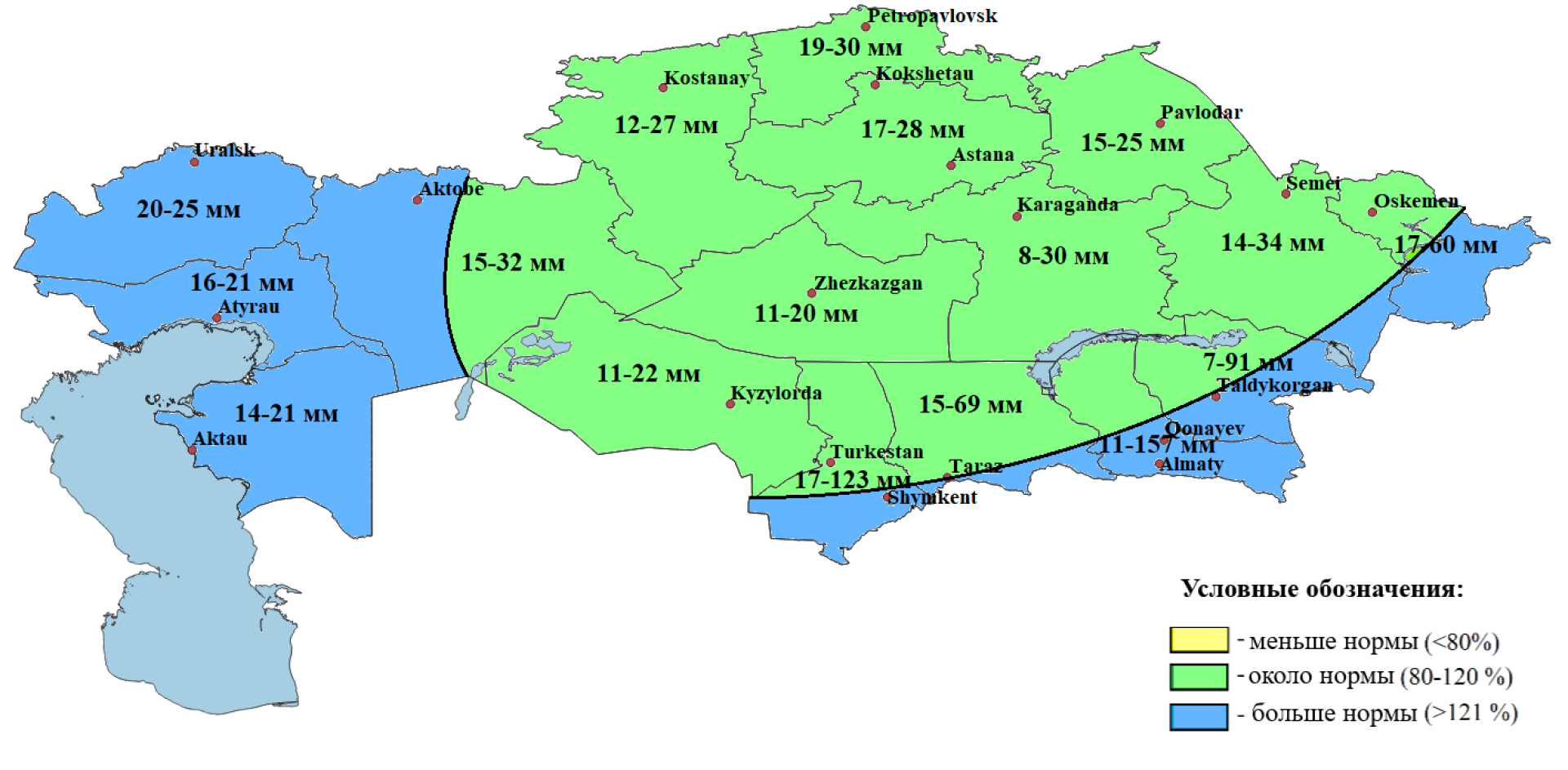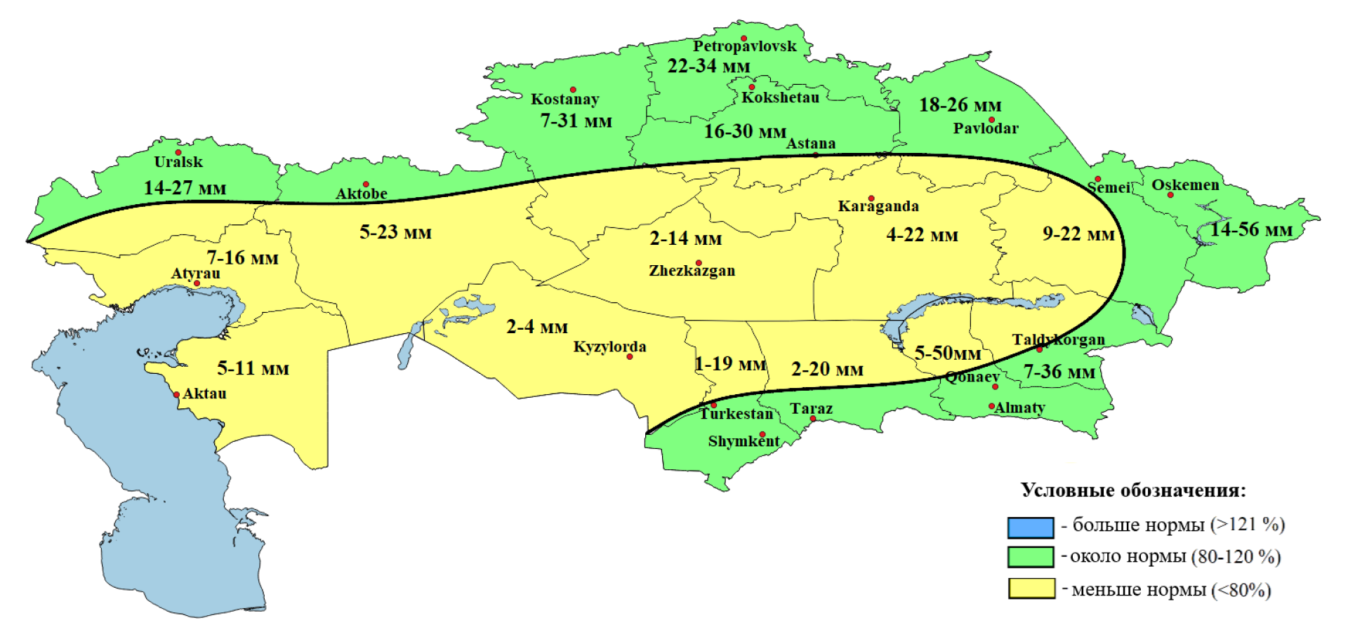 - Меньше нормы — в северных областях (Костанайская, СКО, Акмолинская) и частично в западных и центральных регионах.