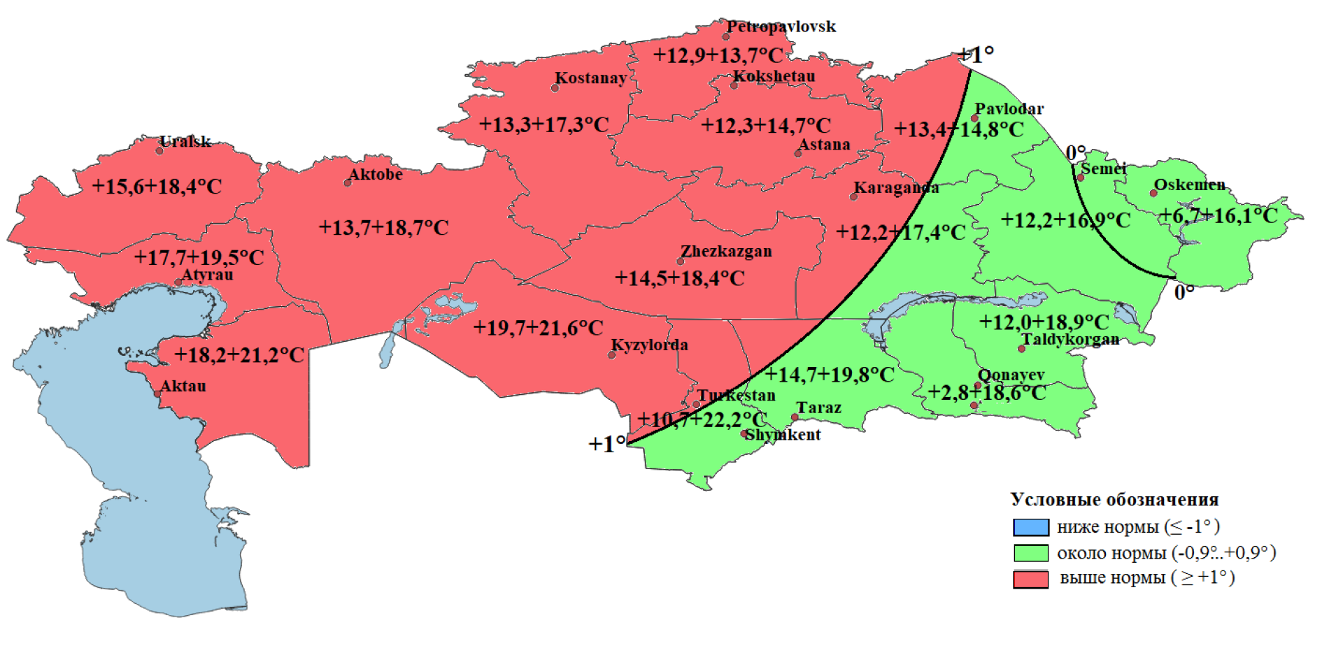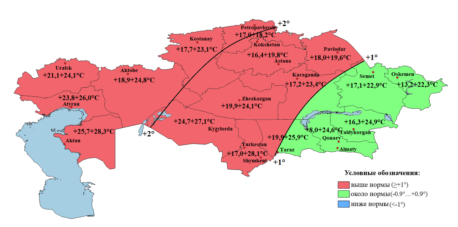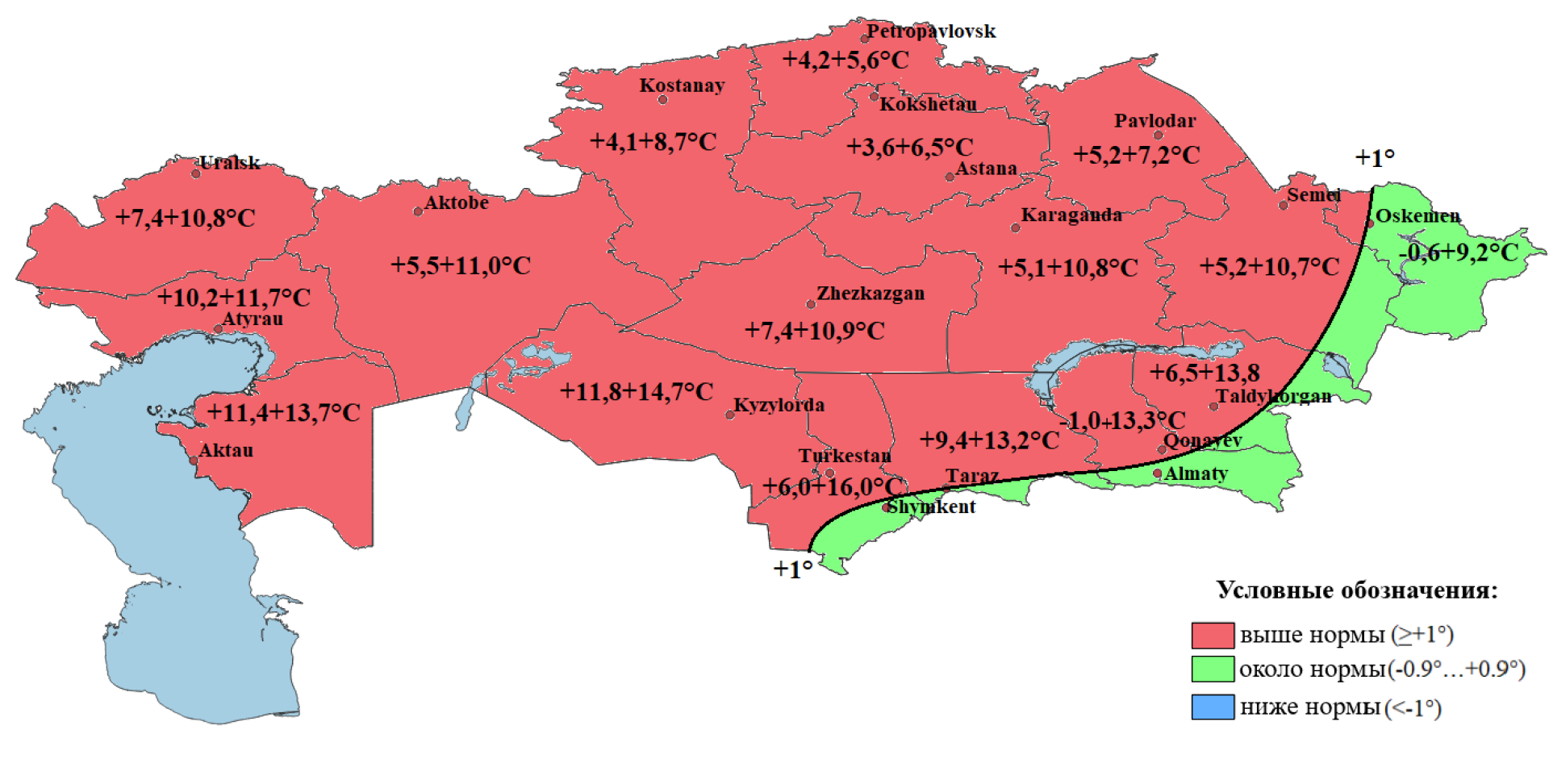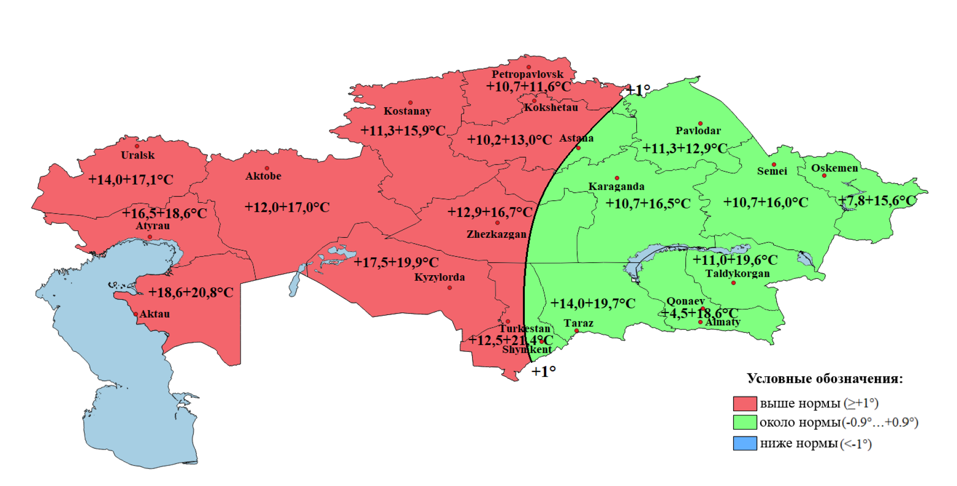 - Меньше нормы — в северных областях (Костанайская, СКО, Акмолинская) и частично в западных и центральных регионах.