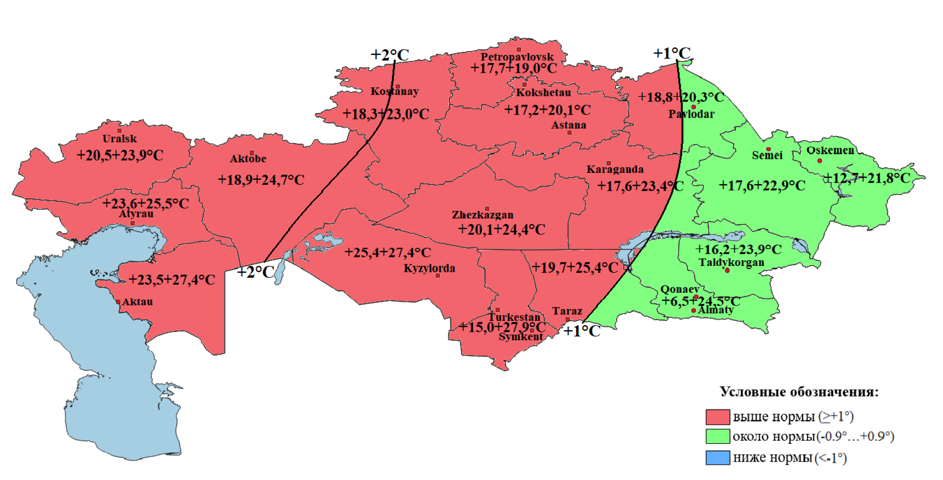 В сентябре температура будет на 1 градус выше нормы почти по всей стране, за исключением Жамбылской, Алматинской, областей Жетысу и Абай, Восточно-Казахстанской, Павлодарской, большей части Карагандинской, восточной половины Туркестанской и юго-востока Акмолинской области, где температура ожидается близкой к норме.